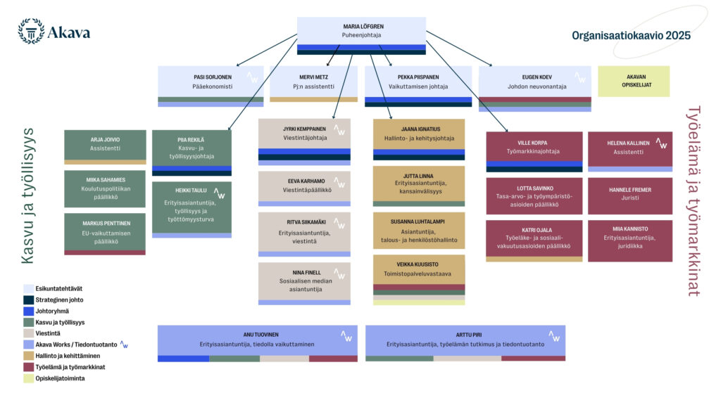 Akavan toimiston organisaatio muodostuu neljästä kokonaisuudesta: kasvu ja työllisyys, työelämä ja työmarkkinat, viestintä ja tiedontuotanto (Akava Works) ja kehittäminen, hallinto ja talous. Näiden lisäksi esikuntatoiminnossa työskentelevät henkilöt toteuttavat Akavan strategiaa puheenjohtajan, johtoryhmän ja koko toimiston tukena ja toimivat vaikuttajatehtävissä. Organisaatio on rakennettu Akavan strategian painopisteiden mukaisesti.